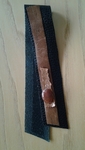 2013Boekenlegger van twee kleuren leer, zwart en bruin. hierop gemonteerd een gehamerd koperen plaatje en een halfedelsteen, bruin agaat.